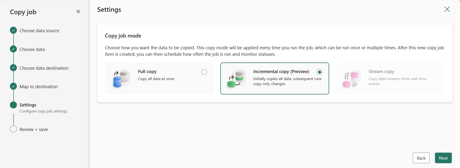 Choisissez un mode de copie : copie complète des données ou copie incrémentielle. Dans cet exemple, nous utilisons la copie incrémentielle afin que le travail de copie copie tous les fichiers lors de la première exécution, puis copiez uniquement les fichiers nouveaux ou mis à jour dans les prochaines exécutions.