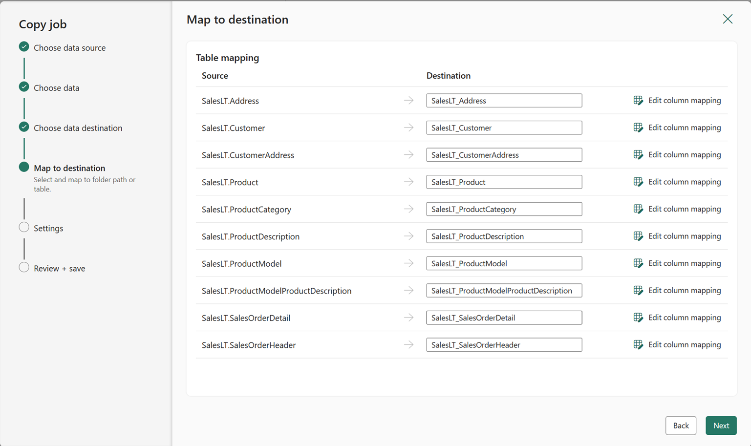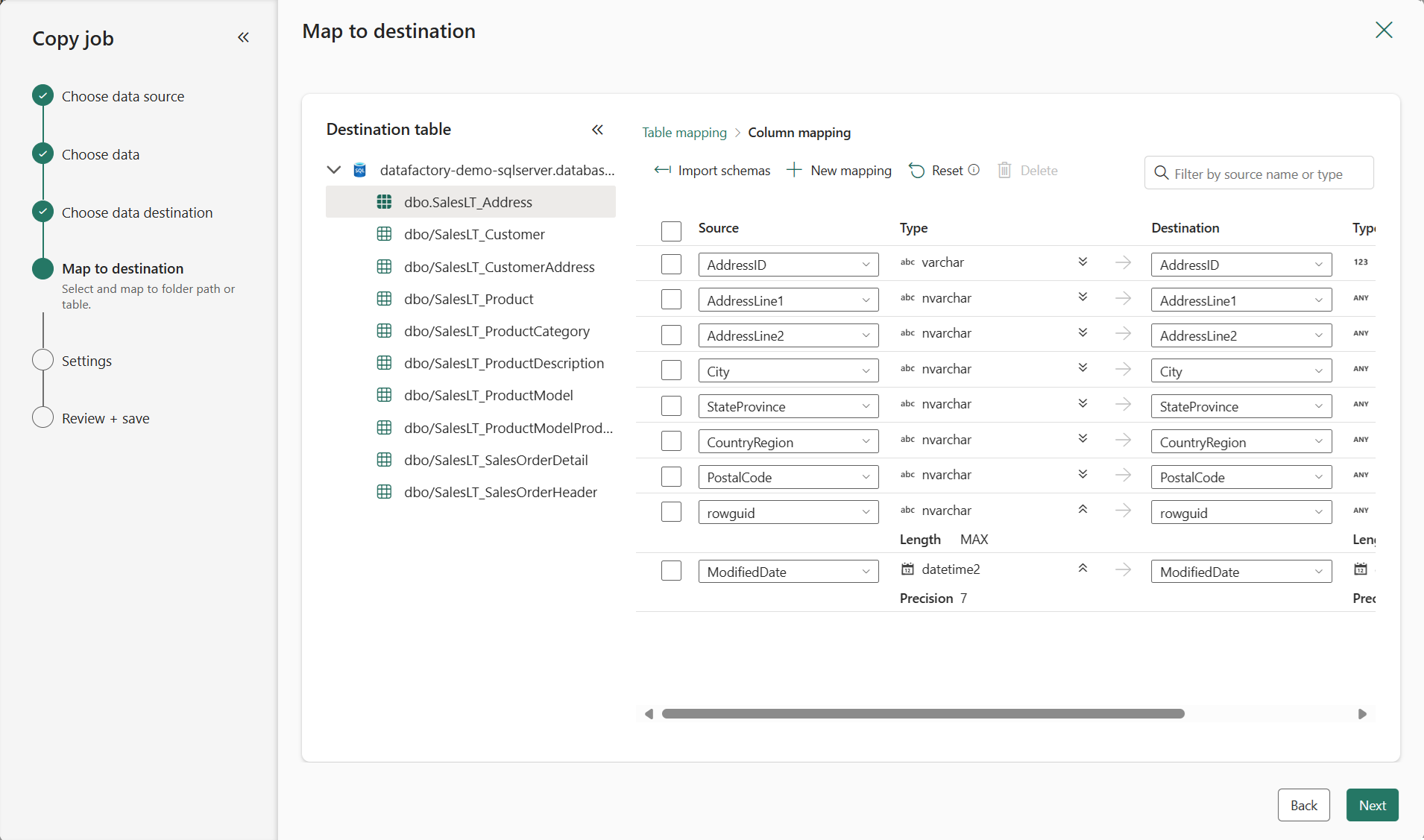 (Facultatif) Configurez le mappage de table ou de colonne pour renommer des tables ou des colonnes dans la destination, ou appliquez des conversions de type de données. Par défaut, les données sont copiées avec le même nom de table, le nom de colonne et le type de données que la source.