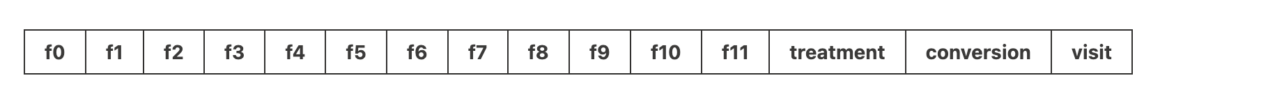 Criteo AI Lab a créé le jeu de données. Ce jeu de données comporte 13 M de lignes. Chaque ligne représente un utilisateur. Chaque ligne a 12 attributs, un indicateur de traitement et deux étiquettes binaires comprenant la visite et la conversion.