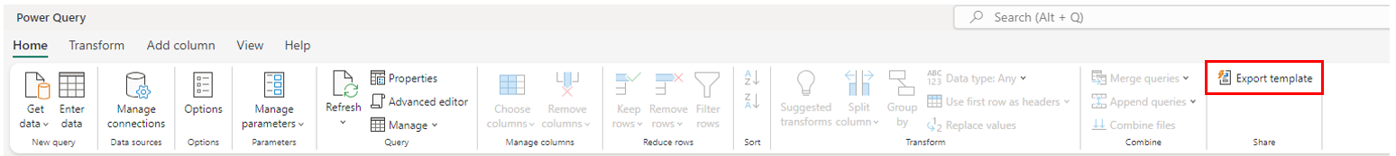 Dans votre Datamart Power BI, sélectionnez Transformer des données dans le ruban Accueil . Choisissez Exporter un modèle pour exporter votre schéma de datamart Power BI et vos données en tant que modèle dans Power Query Online.