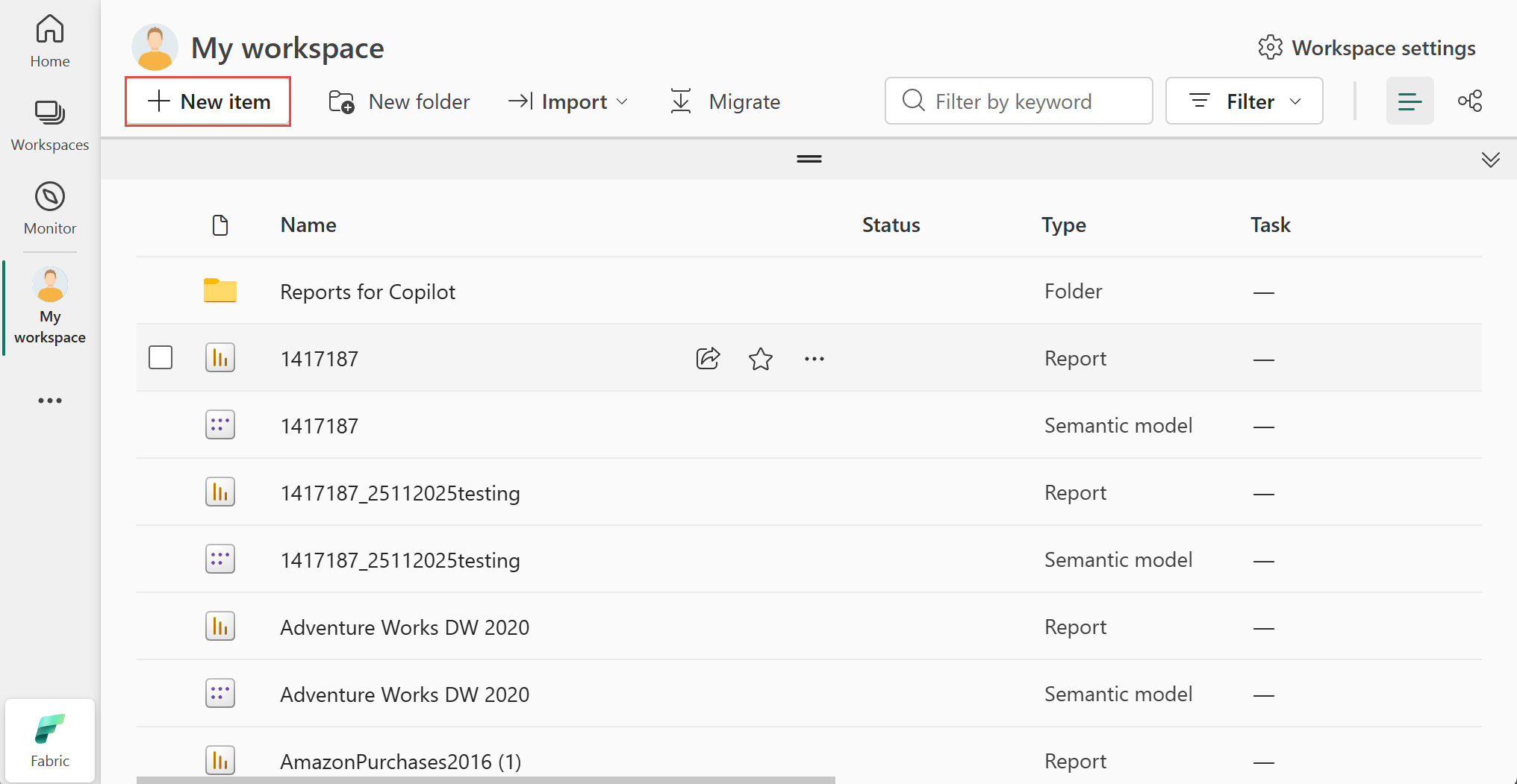 Dans le portail Fabric, basculez vers l’expérience Fabric si nécessaire, puis sélectionnez Mon espace de travail.