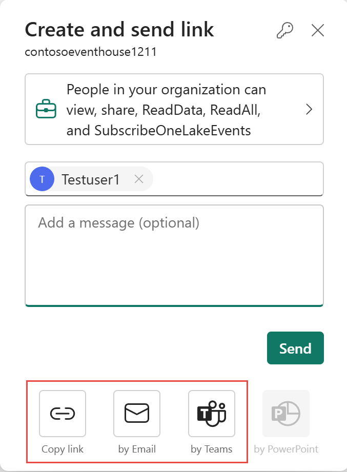 Sélectionnez By Teams pour partager le lien eventhouse via Microsoft Teams. Vous pouvez également ajouter un message à la notification Teams.