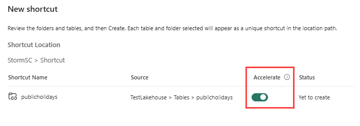 Les raccourcis dans les bases de données KQL prennent en charge l’accélération des requêtes. Pour activer l’accélération des requêtes sur un nouveau raccourci, mettez le bouton Accélérer sur On.