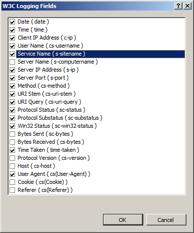 (Facultatif) Dans la boîte de dialogue Champs de journalisation W3C, sélectionnez les champs W3C que vous souhaitez journaliser, désactivez tout champ W3C que vous ne souhaitez pas journaliser, puis cliquez sur OK.