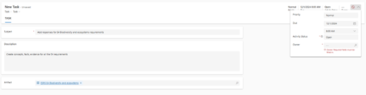 Dans cette tâche, vous créez une tâche de collaboration CSRD E4 Exigences en matière de biodiversité et d’écosystèmes, puis vous l’affectez à une autre personne.