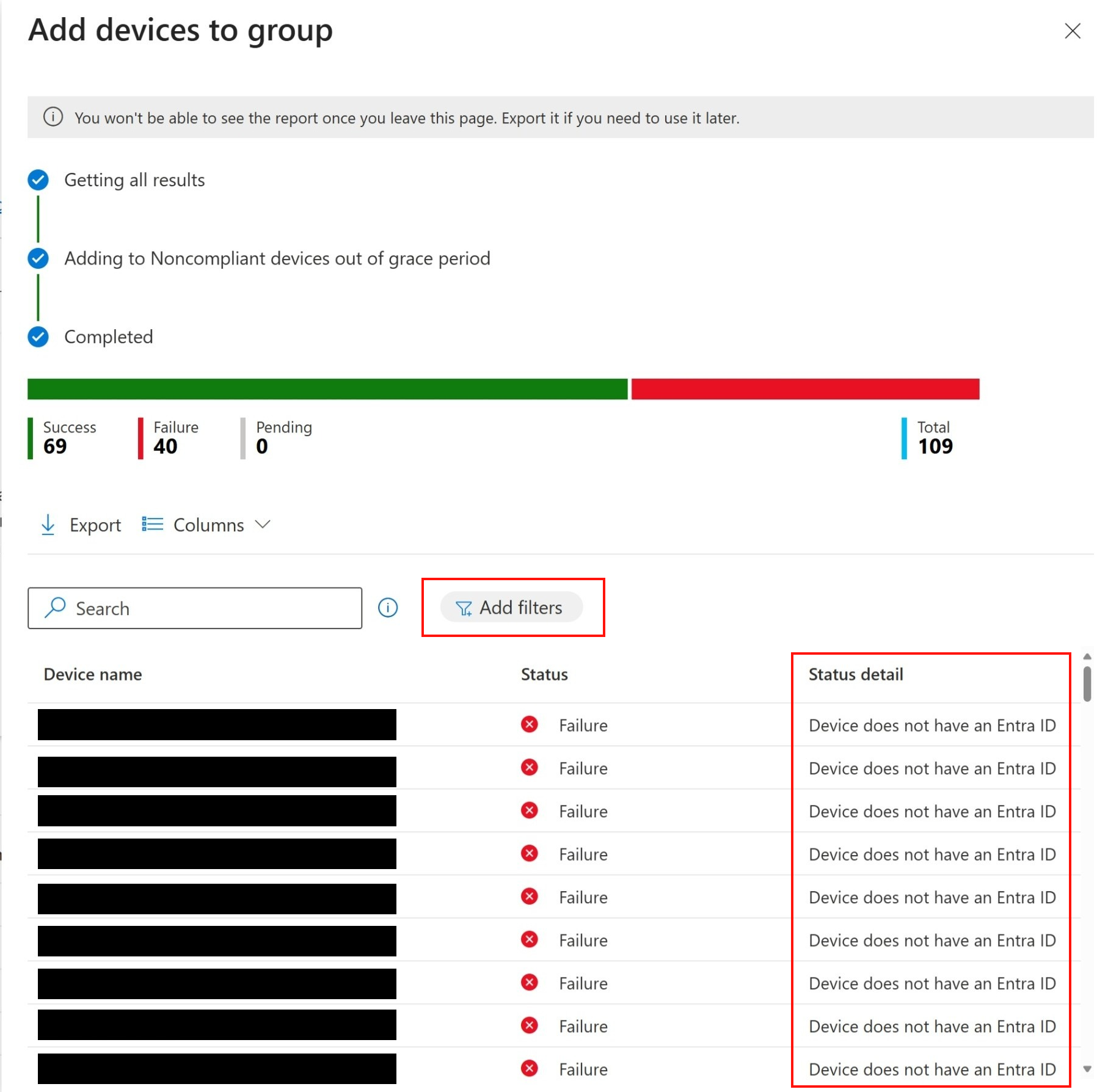 Dans l’exemple suivant, une requête a trouvé des appareils non conformes qui ont dépassé la période de grâce. Ces appareils sont ajoutés à un groupe. Certains appareils n’ont pas pu être ajoutés au groupe, et le détail État en indique la raison. Vous pouvez utiliser l’option Ajouter des filtres pour filtrer les résultats, comme les appareils qui ont été correctement ajoutés au groupe.
