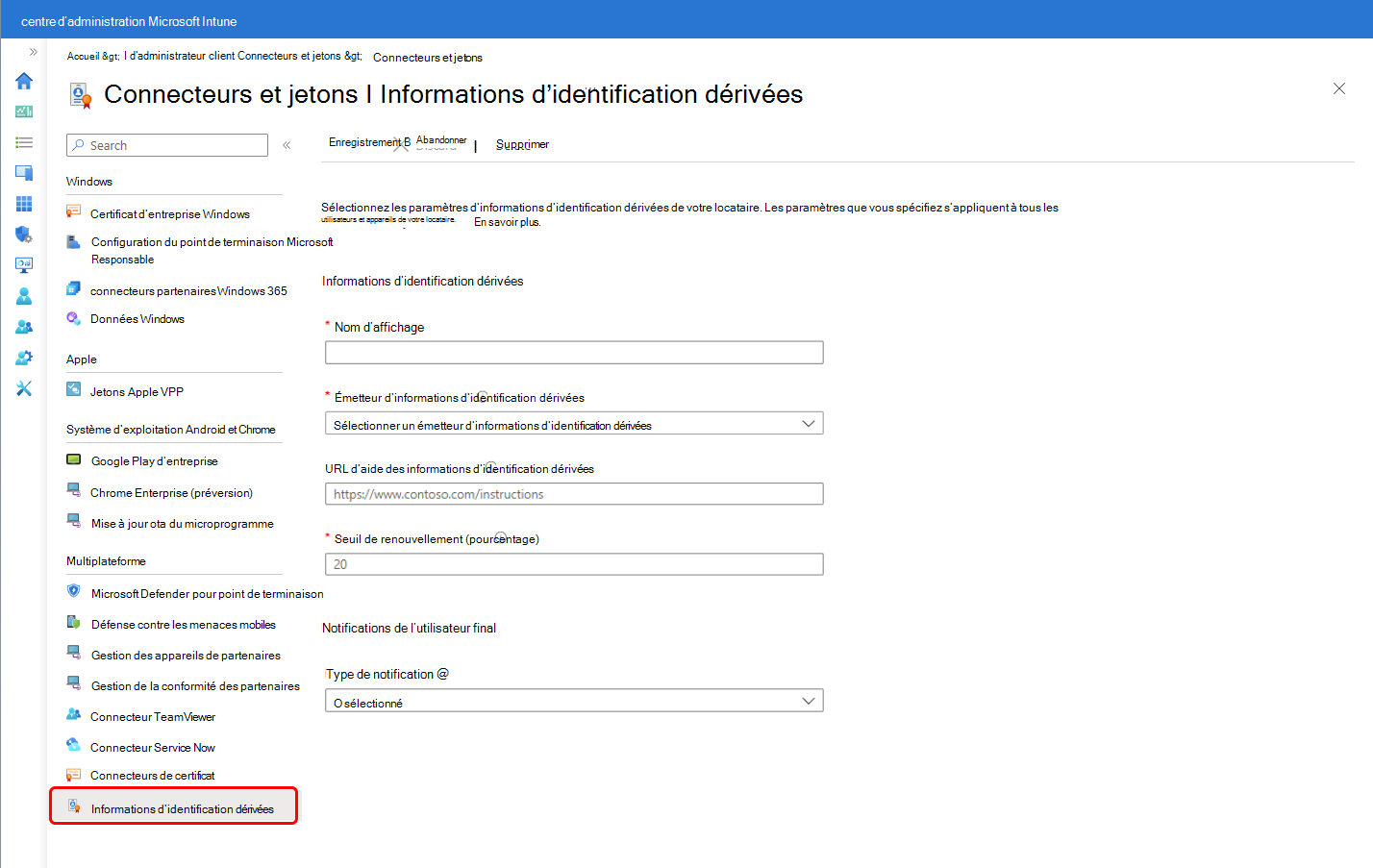 Nous vous recommandons de fournir une URL qui héberge vos conseils. Vous spécifiez cette URL lorsque vous configurez l'émetteur d'accréditations dérivées pour votre locataire, et cette URL est disponible dans l'application du portail de l'entreprise. Si vous ne spécifiez pas votre propre URL, Intune fournit un lien vers des détails génériques. Ces détails ne peuvent pas couvrir tous les scénarios et peuvent ne pas être adaptés à votre environnement.