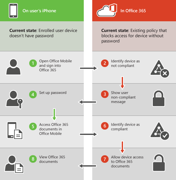 Le diagramme suivant montre ce qui se passe lorsqu’un utilisateur tente d’accéder aux ressources de l’entreprise à l’aide de l’application Office Mobile sur un appareil inscrit. La stratégie applicable nécessite un mot de passe d’appareil, mais l’appareil n’en a pas.