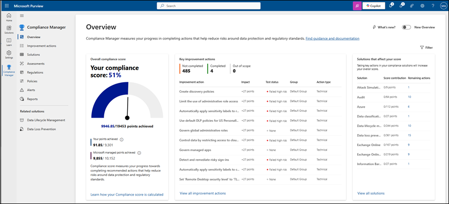 Dans le portail Microsoft Purview à l’adresse https://purview.microsoft.com, accédez auGestionnaire de conformité dessolutions>. Ou, pour accéder directement à la page Vue d’ensemble du Gestionnaire de conformité, utilisez https://purview.microsoft.com/compliancemanager/overviewpage.