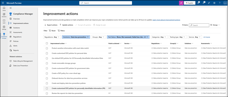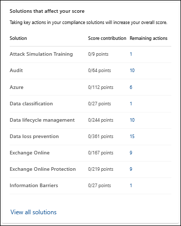 Par exemple, dans la section Solutions qui affectent votre score , la sélection de la valeur dans la colonne Actions restantes pour la solution de protection contre la perte de données ouvre la page Actions d’amélioration filtrée par Solutions : Protection contre la perte de données.