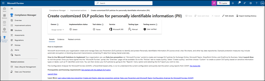 Par exemple, la sélection de Créer des stratégies DLP personnalisées pour les informations d’identification personnelle (PII) ouvre la page des actions détaillées avec plus d’informations sur la stratégie à configurer.