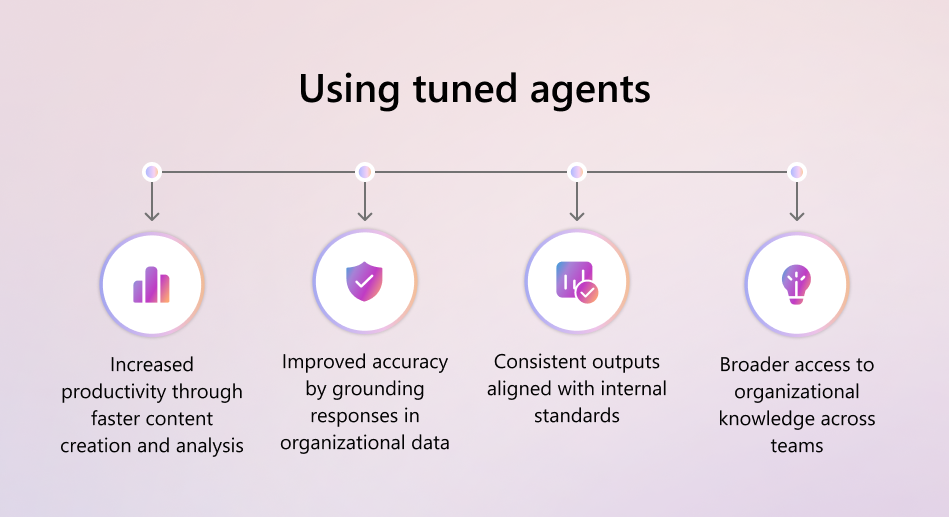 Intégration aux données Microsoft 365 : les agents Tuned peuvent utiliser le contenu et la raison de l’organisation sélectionnés par rapport aux données d’entreprise actives via Microsoft Graph, ce qui permet de s’assurer que les réponses sont ancrées dans des informations à jour.