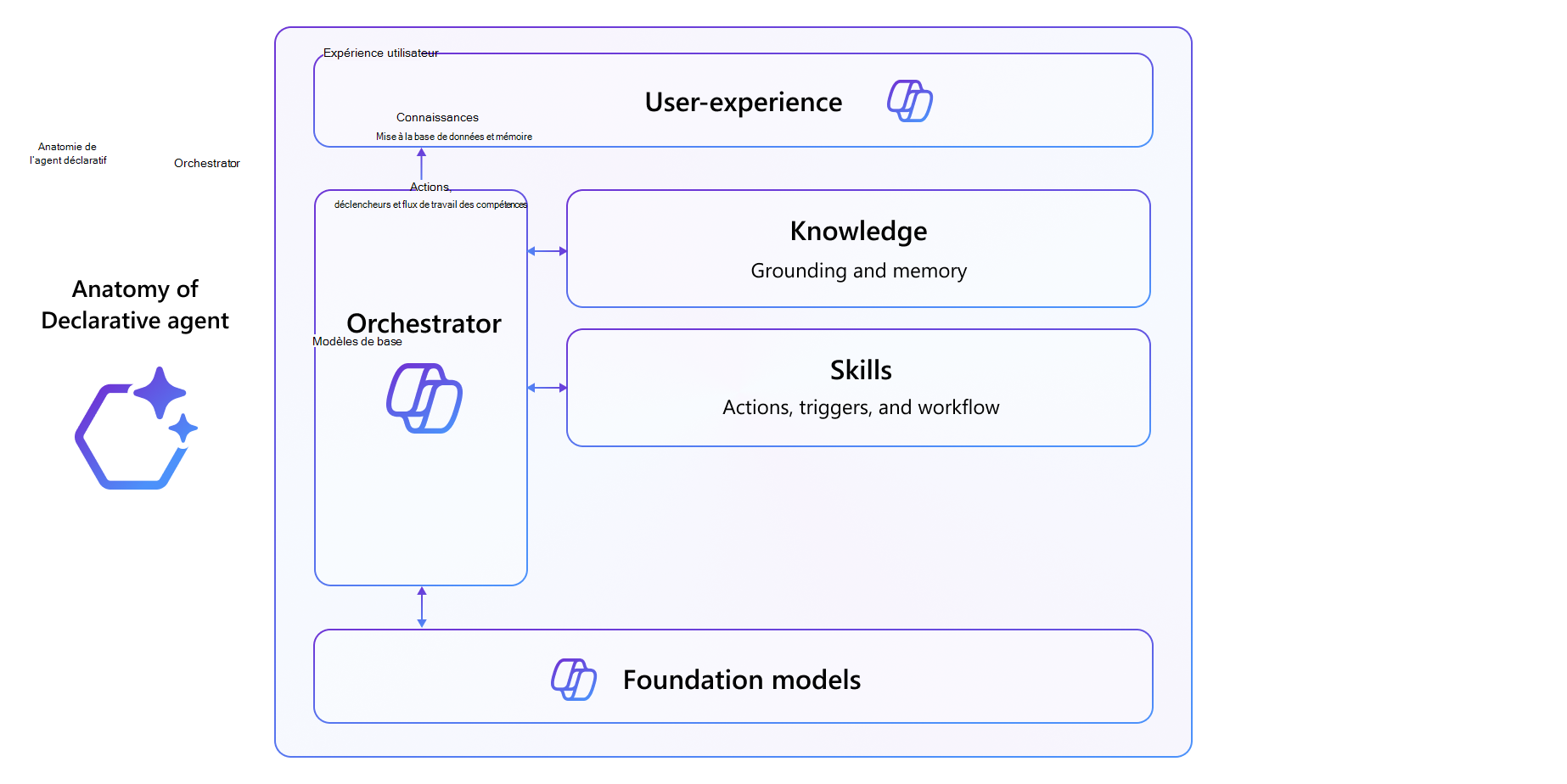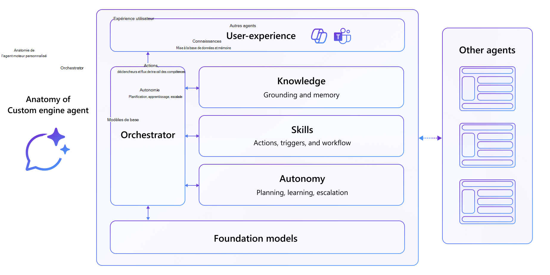 - La couche d’expérience utilisateur garantit une interaction transparente entre les utilisateurs et les agents en intégrant des agents dans des applications Microsoft 365 ou des plateformes externes pour un workflow intuitif et efficace.