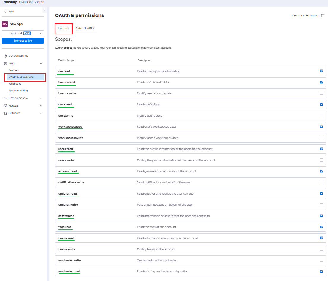 Dans la section Générer , ouvrez l’onglet Autorisation OAuth & , choisissez l’onglet Étendues et activez toutes les autorisations de lecture.