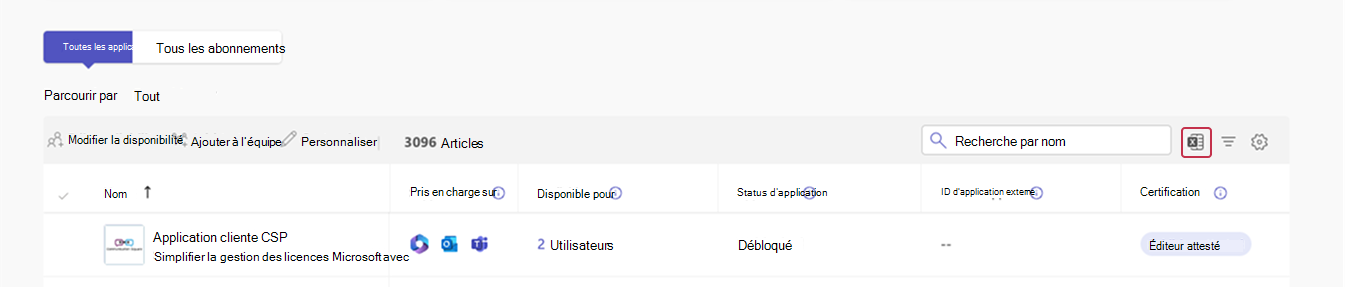 Accédez à la page Gérer les applications et exportez la liste complète des applications du catalogue sous la forme d’un fichier CSV, y compris les status d’application autorisées ou bloquées de chaque application. La status autorisée ou bloquée détermine si l’application est disponible pour tout le monde ou personne, respectivement. Cette status est utilisée dans les étapes suivantes pour filtrer vos utilisateurs. Pour plus d’informations, consultez Exporter le catalogue d’applications au format CSV.