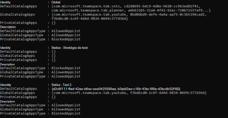 Par exemple : $msftApps = Get-CsTeamsAppPermissionPolicy -Identity "Global" | Select-Object -ExpandProperty DefaultCatalogApps $msftApps.id