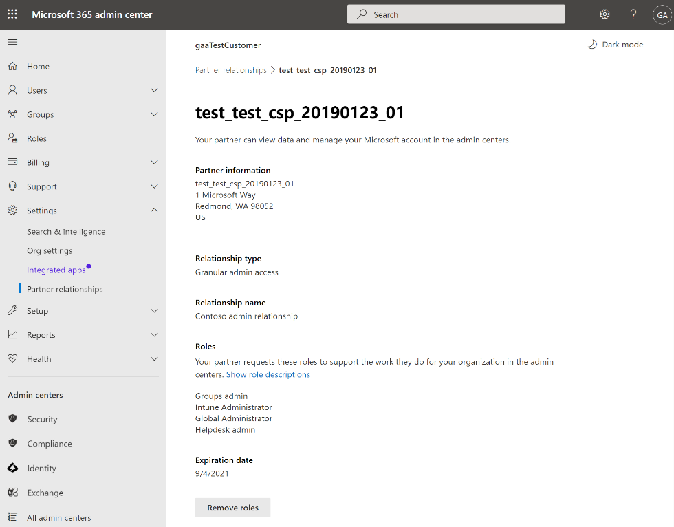 Votre client peut décider de supprimer vos privilèges administratifs délégués granulaires (GDAP) de son locataire. Les clients gèrent les droits et les autorisations de leurs comptes Microsoft 365 sur la page Relations partenaires dans le Centre d’administration Microsoft 365. Sur cette page, les clients peuvent :