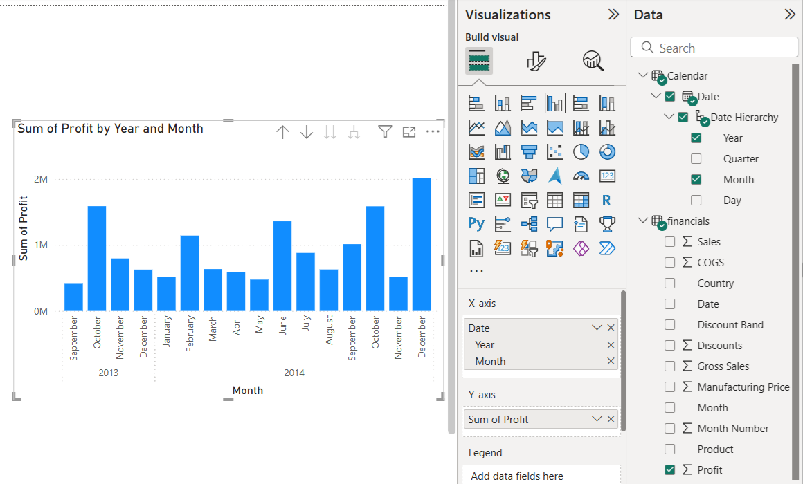 Si vous avez créé une table Calendrier dans la section Crédit supplémentaire : Créez une nouvelle table plus haut dans cet article, développez le champ Date dans le volet Données, puis cochez la case pour la hiérarchie de dates. Développez le champ, puis décochez les cases en regard des champs Trimestre et Jour pour afficher uniquement l’année et le mois sur le graphique. Vous pouvez également supprimer les champs de là où ils sont listés dans l’axe X dans l’onglet Créer un visuel du panneau des Visualisations.