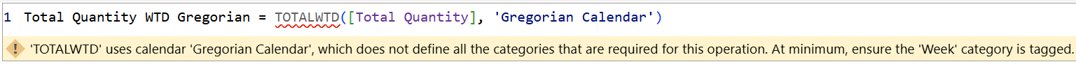 L’intelligence temporelle basée sur le calendrier fournit directement des fonctions DAX qui fonctionnent à une granularité de semaine. Par exemple, les totaux hebdomadaires à jour peuvent être calculés directement à l’aide de TOTALWTD: