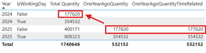 Toutes les valeurs de OneYearAgoQuantity et OneYearAgoQuantityTimeRelated pour 2025 correspondent à la quantité totale d’un an avant (2024) pour la même valeur IsWorkingDay .