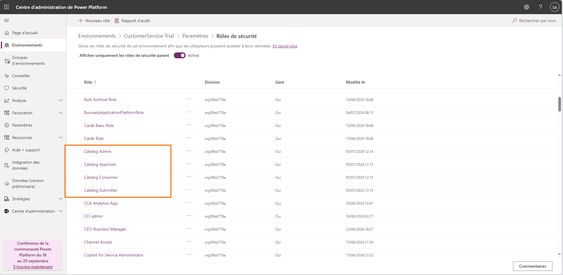 Tout environnement doté d’un catalogue a ces rôles visibles dans le Power Platform centre d’administration et peut être attribué à des groupes ou à des individus comme n’importe quel autre rôle de sécurité.