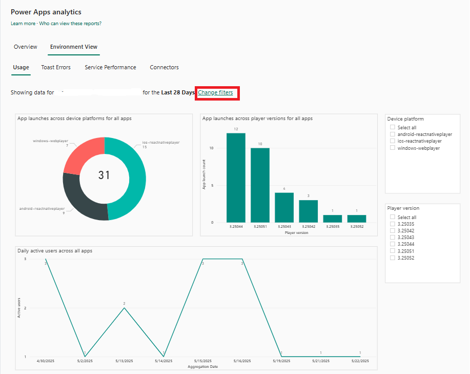 Sélectionnez l’environnement et la période dans les listes déroulantes, puis sélectionnez Appliquer pour enregistrer les modifications. Tous les rapports d’analytique Power Apps reflètent maintenant cette sélection.