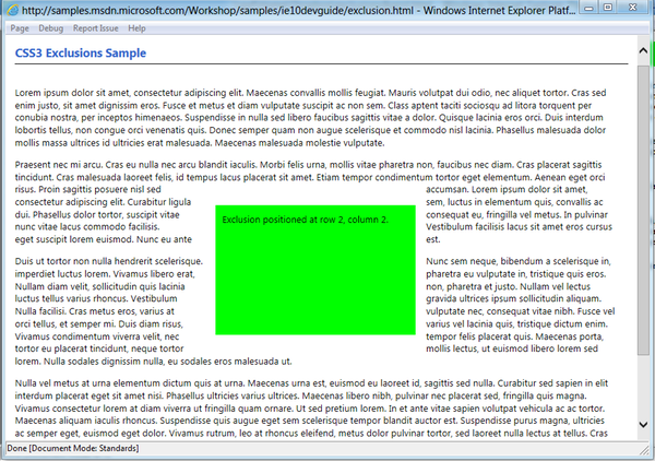 You can also use CSS Exclusions with the new CSS Grid functionality in Internet Explorer 10 and Windows apps using JavaScript. For instance, the following image illustrates an exclusion inside a 3×3 grid. The grid contains one div element with inline content that spans all three rows and all three columns. The exclusion has been placed in the grid cell at row 2, column 2. The content flows around the exclusion.
