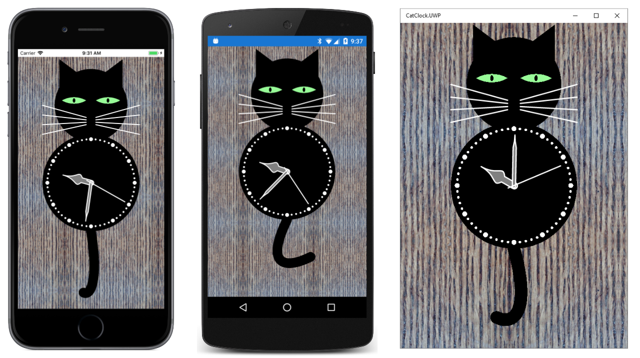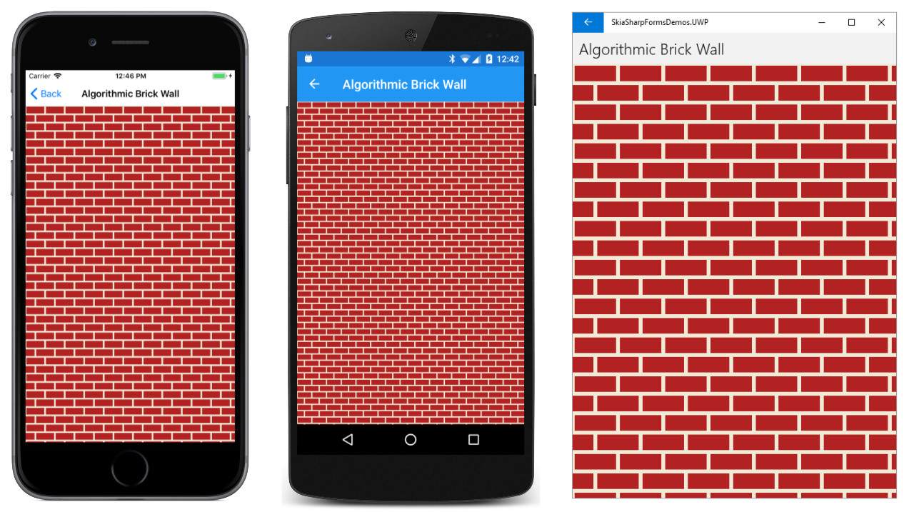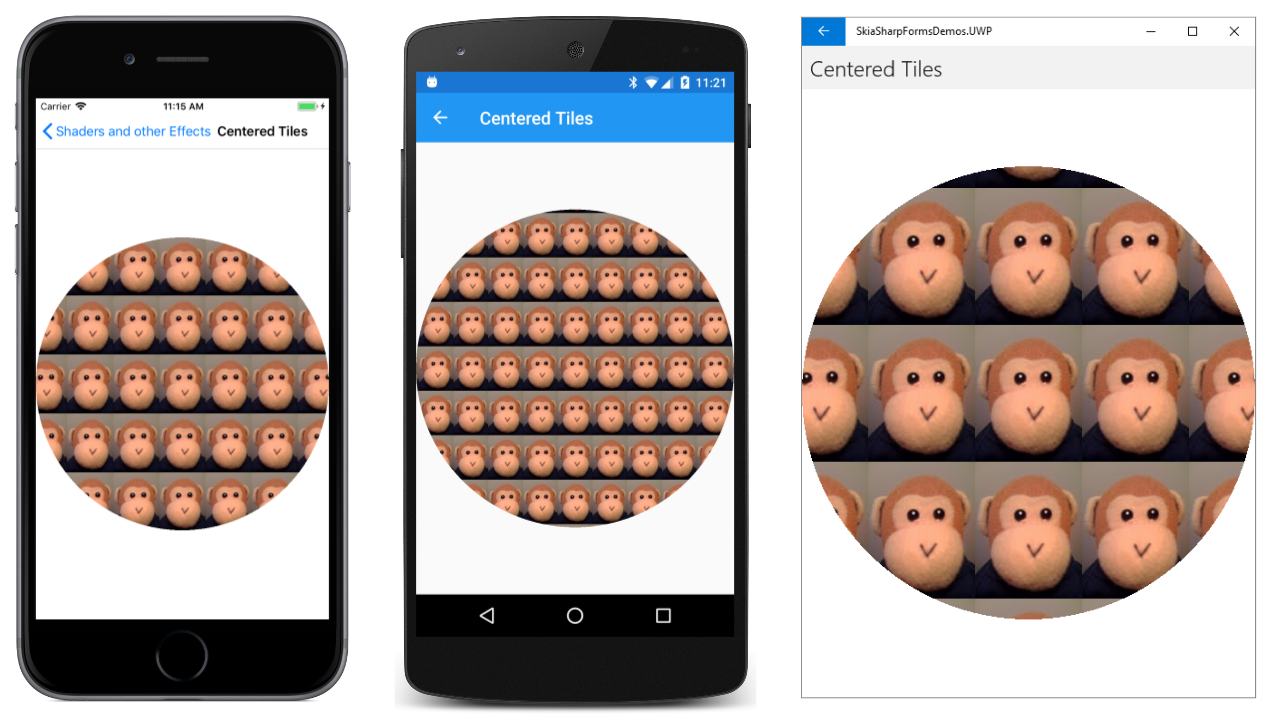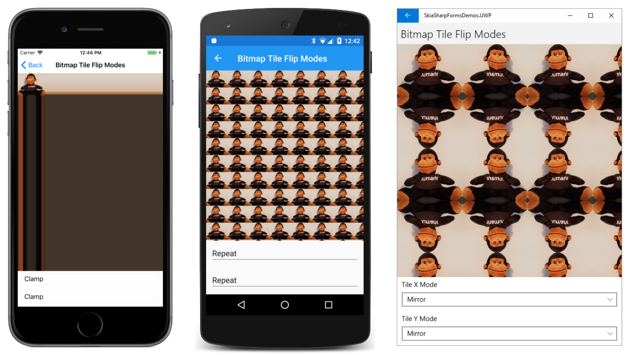 L’écran Android dans le centre affiche le résultat des SKShaderTileMode.Repeat deux arguments. La vignette est répétée horizontalement et verticalement. L’écran plateforme Windows universelle affiche SKShaderTileMode.Mirror. Les vignettes sont répétées, mais retournées horizontalement et verticalement. L’avantage de cette option est qu’il n’existe aucune discontinuité entre les vignettes.