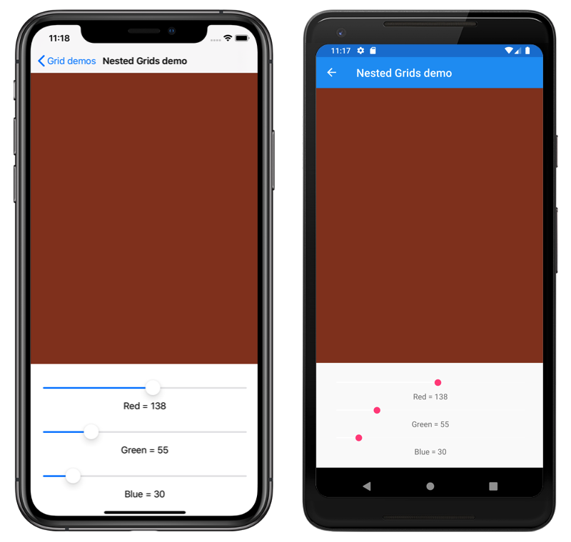 Dans cet exemple, la disposition racine Grid contient une BoxView première ligne et un enfant Grid dans sa deuxième ligne. L’enfant Grid contient des Slider objets qui manipulent la couleur affichée par les BoxViewobjets et Label qui affichent la valeur de chaque Slider: