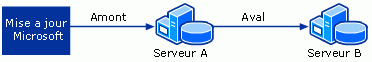 You can create complex hierarchies of WSUS servers. Since you can synchronize one WSUS server with another WSUS server instead of with Microsoft Update, you need to have only a single WSUS server that is connected to Microsoft Update. When you link WSUS servers together, there is an upstream WSUS server and a downstream WSUS server, as shown in the "WSUS Server Hierarchy" illustration below.
