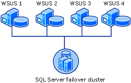 Network load balancing increases the reliability and performance of your WSUS network. You can set up multiple WSUS servers that share a single SQL Server 2005 failover cluster, as in the "Network Load Balancing with a SQL Server Failover Cluster" illustration below. (Note that for this configuration you must use a full SQL Server 2005 installation, not the Base de données interne Windows installation provided by WSUS.) You can also have all the WSUS servers use a DFS share to store their content. See Appendix C: Configure WSUS for Network Load Balancing for more information about configuring WSUS and SQL Server for network load balancing.