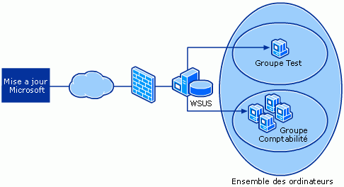 The most basic WSUS deployment consists of a server inside the corporate firewall that serves client computers on a private intranet, as shown in the "Simple WSUS Deployment" illustration below. The WSUS server connects to Microsoft Update to download updates. This is known as synchronization. During synchronization, WSUS determines if any new updates have been made available since the last time you synchronized. If it is your first time synchronizing WSUS, all updates are made available for download.