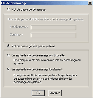 En mode 2 (bouton Mot de passe de démarrage et champs texte associés), la clé de cryptage est "super" cryptée avec une expression de passe spécifiée par l'administrateur. Au moment du démarrage, l'administrateur doit saisir l'expression de passe sur la console pour terminer l'opération. Le système ne démarrera pas tant que l'expression de passe n'aura pas été saisie.