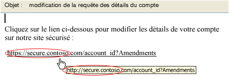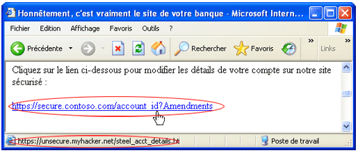 La figure suivante montre un exemple de lien conduisant en apparence à un site de gestion de compte sécurisé (secure.contosa.com account_id?Amendments), alors que la barre d'état indique qu'il conduit l'utilisateur à un site de pirate. En fonction du navigateur que vous utilisez, un pirate peut supprimer ou reformater les informations de la barre d'état.