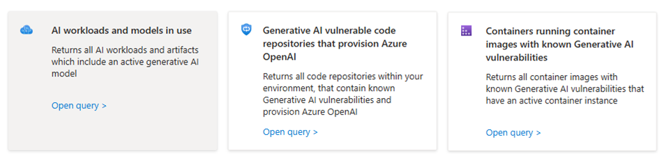 Utilisez l’Explorateur de sécurité cloud pour identifier les charges de travail et les modèles d’INTELLIGENCE artificielle générative s’exécutant dans votre environnement. Cloud Security Explorer inclut des requêtes préconfigurées :