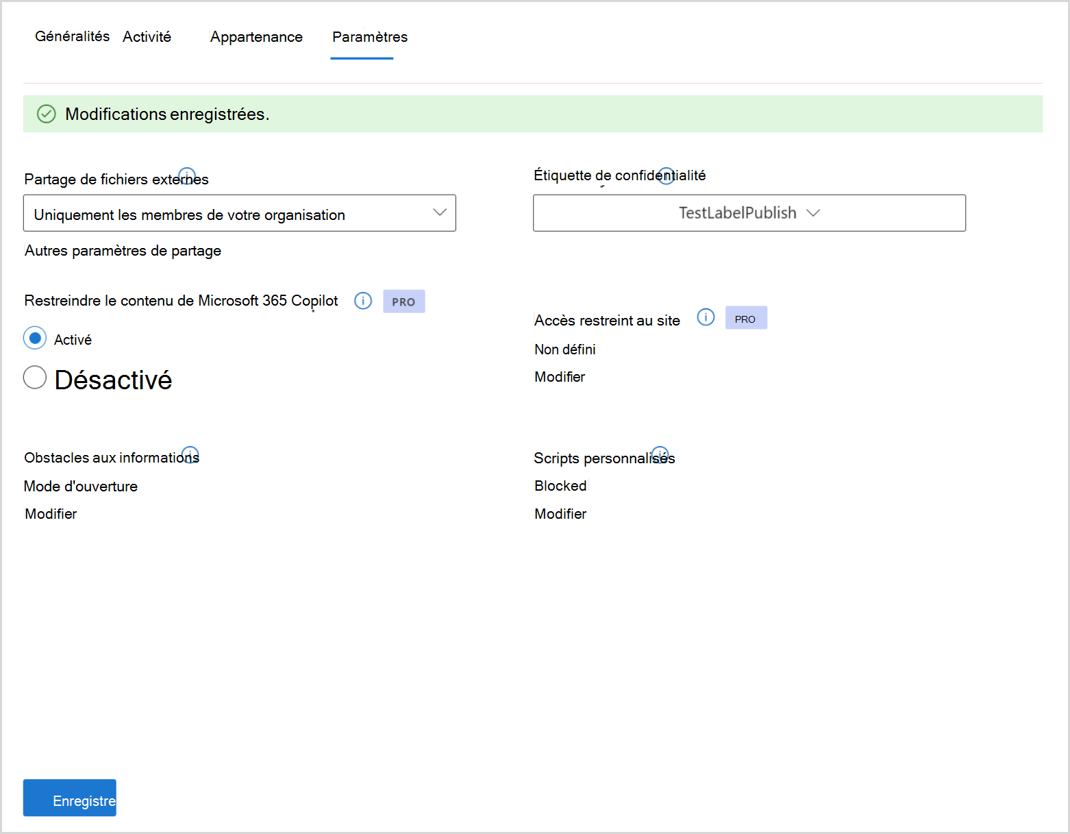 Sous l’onglet Paramètres, activez ou désactivez la section Restreindre le contenu de Microsoft 365 Copilot.
