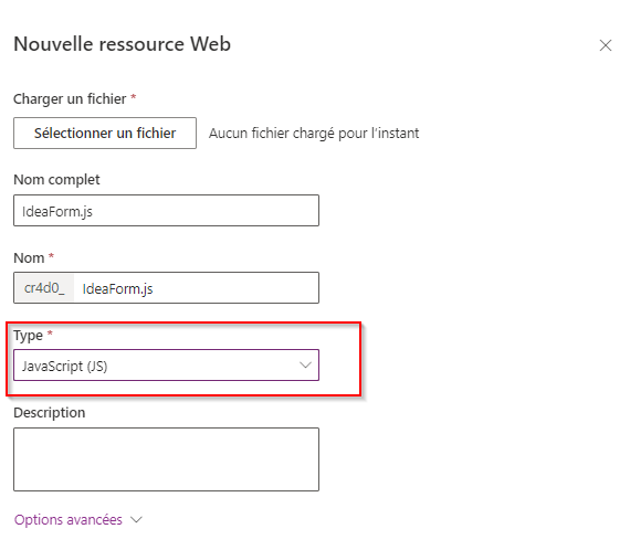 Pour utiliser un script client sur un formulaire, il doit d’abord être chargé en tant que ressource web de script. Les ressources web de script vous permettent de gérer des bibliothèques de fonctions de script client écrites en JavaScript ou TypeScript et vous pouvez les utiliser à partir d’un formulaire d’application pilotée par modèle ou de la définition de la barre de commandes. Si vous utilisez TypeScript, vous devez le transpiler en JavaScript avant de le charger en tant que ressource web.