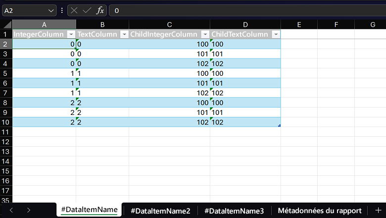 La propriété ExcelLayoutMultipleDataSheets vous permet d’utiliser des états qui affichent plusieurs feuilles de calcul pour les données d’état lorsque le jeu de données comporte plusieurs éléments de données. En définissant la propriété sur true, le runtime AL génère une feuille de calcul Excel pour chaque élément de données et y place ses données. Sinon, si la propriété est définie sur false, à savoir la valeur par défaut, une seule feuille est utilisée pour toutes les données (comme décrit dans la section précédente).