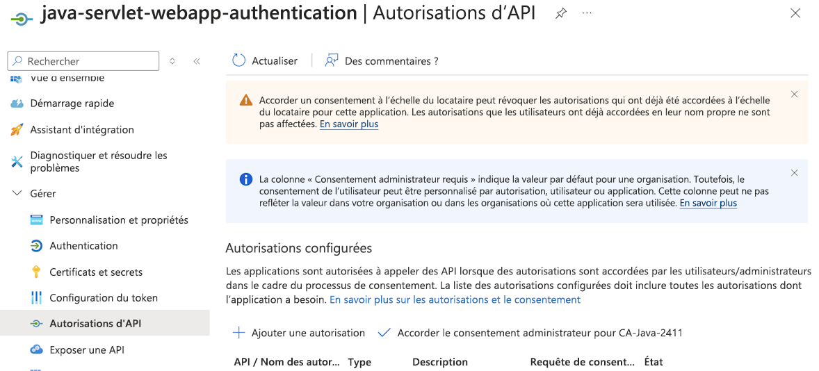 Capture d'écran montrant le volet des autorisations API d'une application enregistrée avec Microsoft Entra ID sur le portail Azure.