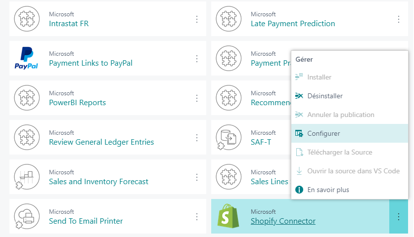 Vous pouvez ajouter une option pour exécuter une page de configuration directement à partir de la page Gestion des extensions si l’application a spécifié une page de configuration. Le développeur de l’application doit fournir une référence à la page de configuration dans le manifeste de l’application pour permettre à Business Central d’identifier la page à exécuter pour l’application spécifique.