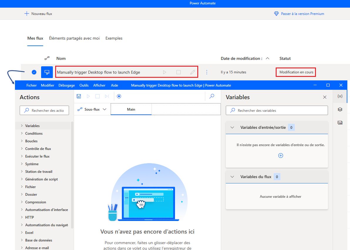 Cette action entraîne l’ajout automatique du nouveau flux dans Power Automate pour le bureau et l’ouverture d’une autre fenêtre avec le flux en cours de modification.