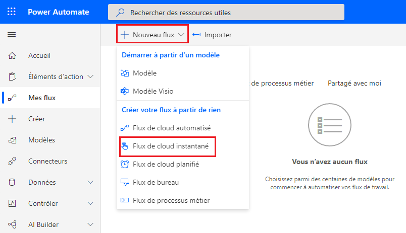 Pour commencer à créer votre flux de cloud, ouvrez Power Automate et cliquez sur Mes flux > Flux de cloud.