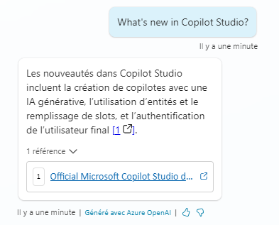 Pour en savoir plus sur cette fonctionnalité spécifique, consultez la documentation Microsoft sur Réponses génératives :