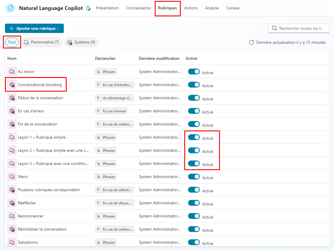 Ensuite, cliquez sur l’onglet Rubriques, sélectionnez Tout, puis ouvrez la rubrique Conversational boosting.