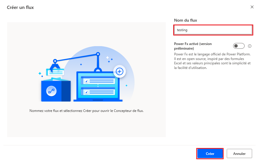 Vous verrez des options pour activer les deux fonctionnalités Power Fx et Réparer les erreurs de flux. Ces options ne sont pas utilisées dans ce parcours d’apprentissage et peuvent entraver votre progression si elles sont activées. Une fois que vous serez à l’aise avec Power Automate pour le bureau, vous pourrez activer ces fonctionnalités à l’avenir pour étendre vos aptitudes lors de la création de flux.