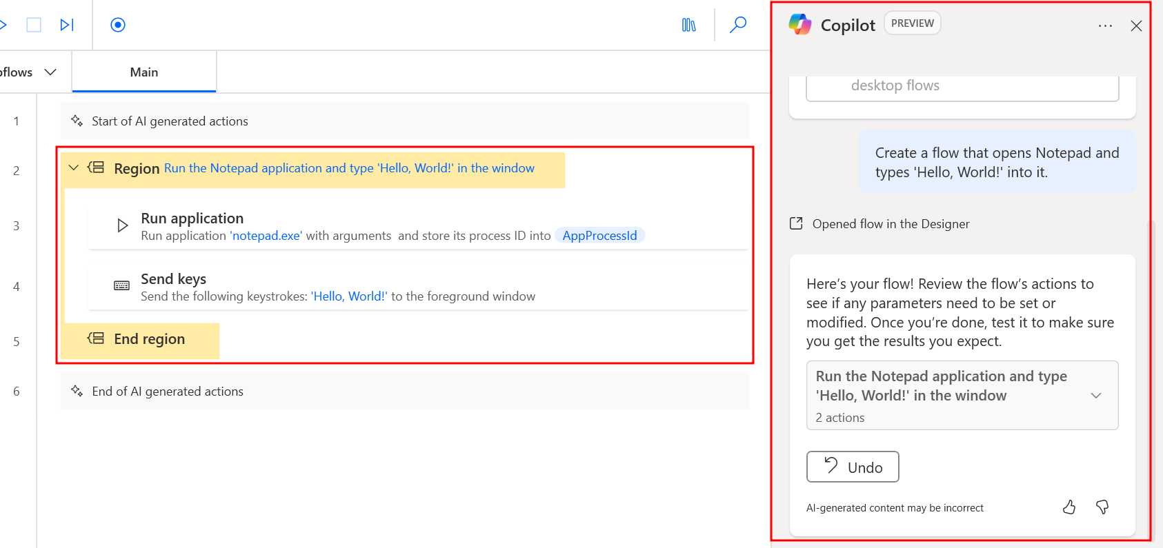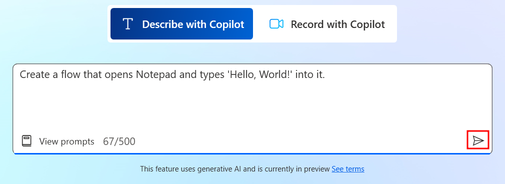 Create a flow that opens Notepad and types 'Hello, World!' into itUne fois que vous avez saisi l’invite, Copilot commence à concevoir le flux.
