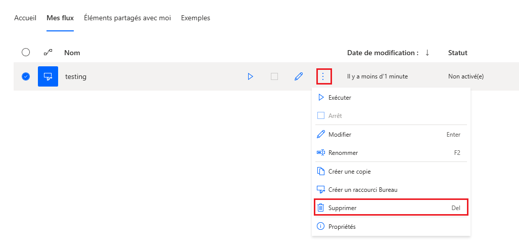 Cliquez avec le bouton droit ou cliquez sur le menu des points de suspension (…) à droite du flux, puis sélectionnez Supprimer pour supprimer le flux de bureau test.