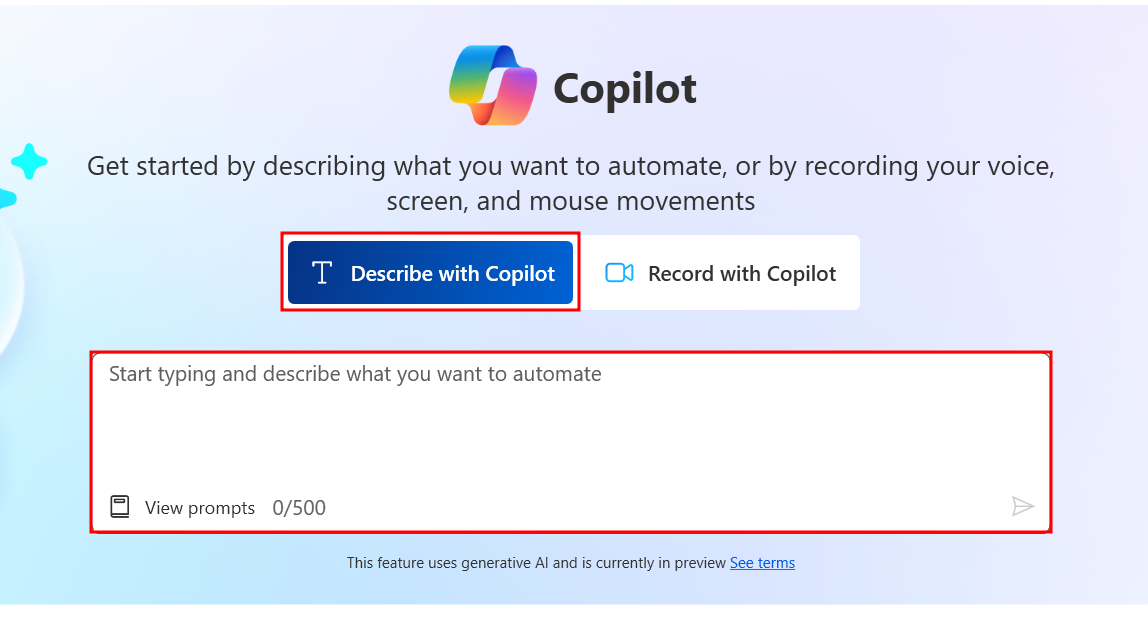 En haut de la page Accueil, cliquez sur le bouton Décrire avec Copilot.