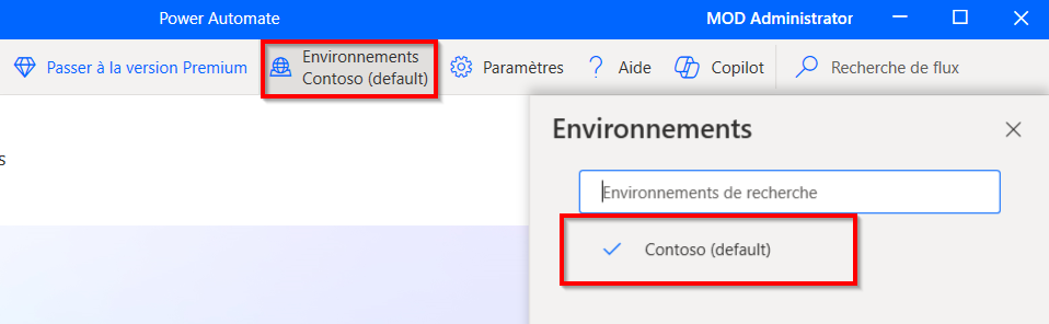 Cliquez sur le menu déroulant Environnements dans la partie supérieure de la page pour remplacer votre environnement par l’environnement adéquat.