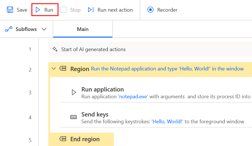 Examinez les actions Exécuter l’application et Envoyer une séquence de touches : il s’agit des étapes de flux développées par Copilot.